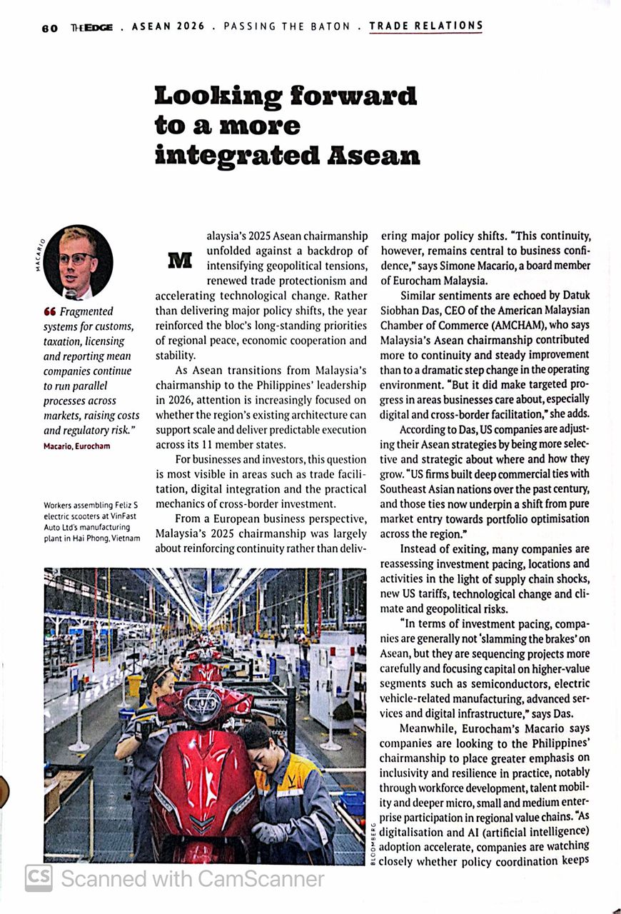 In a recent special feature in The Edge Malaysia, EUROCHAM Board Member, Simone Macario, shared insights on how the success of the upcoming chairmanship will be measured by its ability to provide a more integrated and predictable environment for European companies. While Malaysia’s 2025 chairmanship provided essential continuity, the next phase must focus on scale and execution.